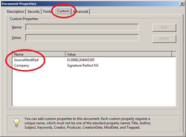 <testcase name="hasProperty_CustomProperties"> <assertThat testDocument="customproperties/Leitfaden_Elektronische_Signatur.pdf"> <hasProperty name="Company"> <matchingComplete>Signature Perfect KG</matchingComplete> </hasProperty> <hasProperty name="SourceModified"> <matchingComplete>D:20081204045205</matchingComplete> </hasProperty> </assertThat> </testcase>